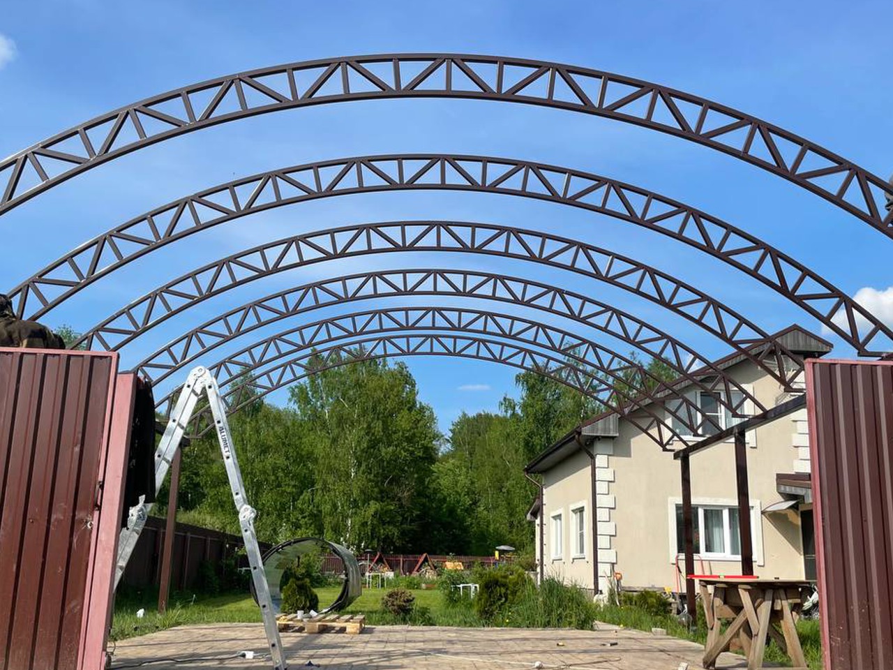 За день на даче изготовили арочный навес 5 на 7 с покрытием поликарбоната. Привезли уже готовые крашенные фермы и весь остальной материал. Все за собой убрали и увезли мусор. Молодцы!